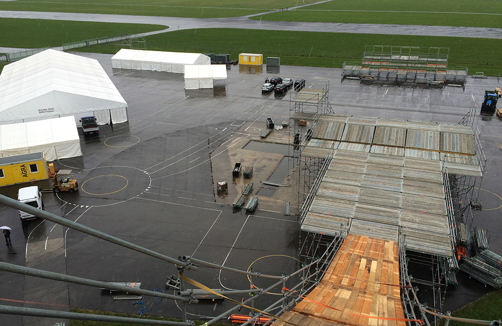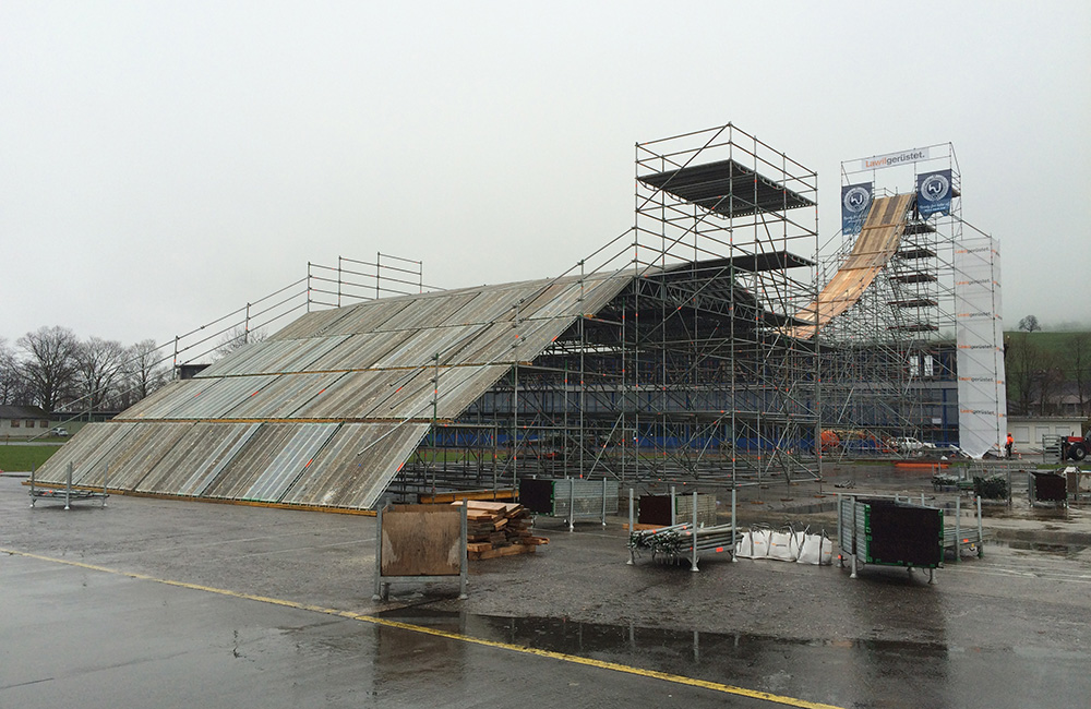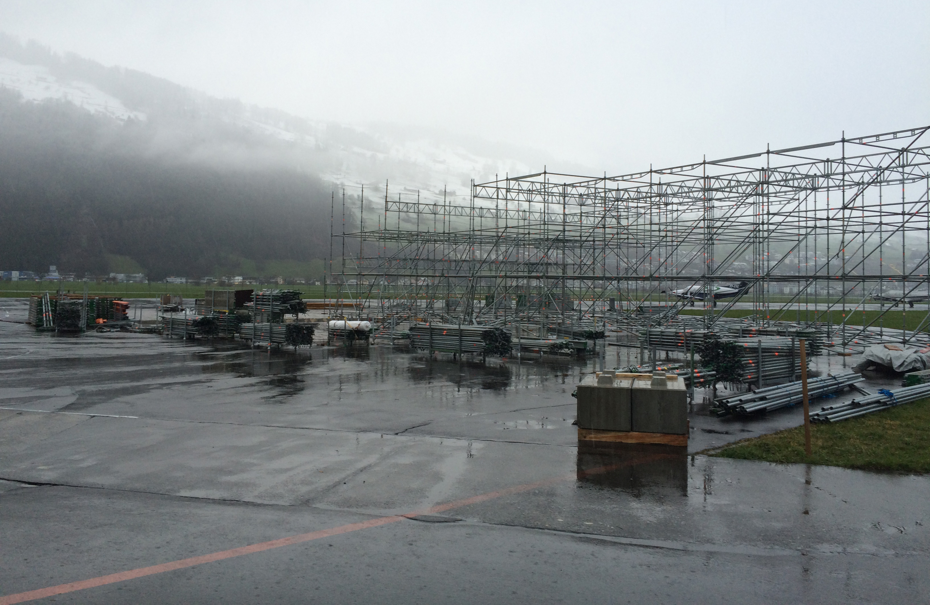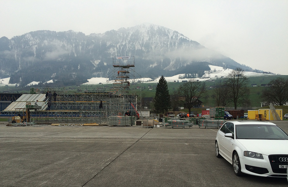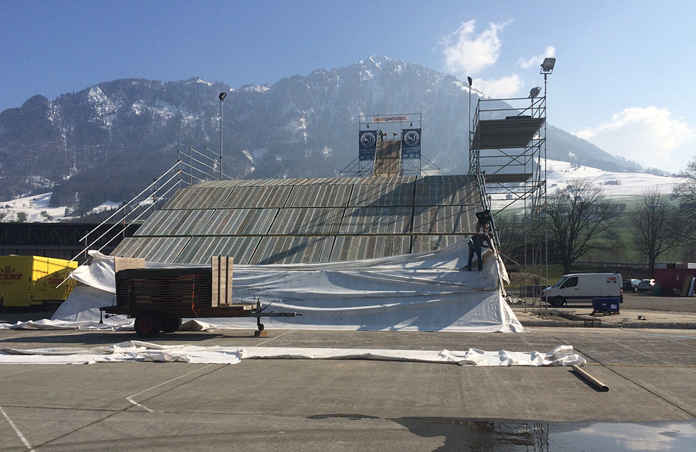 Am Donnerstag, 3. März starteten die Aufbauarbeiten für die Infrastruktur für den Freestyle-Event hill jam 8. Rund 80 Tonnen Gerüstmaterial wurden eigens dafür von Lawil Gerüstet auf den Flugplatz Buochs gebracht. Genug Material um die 20 m hohe Lawil-Rampe sowie die Tribühne und das Eingangstor zu errichten. Dank der Hilfe der rund 270 freiwilligen Helfer und ein paar schweren Maschinen wurde innert weniger Tage das Areal 2016 aus dem Boden gestampft.