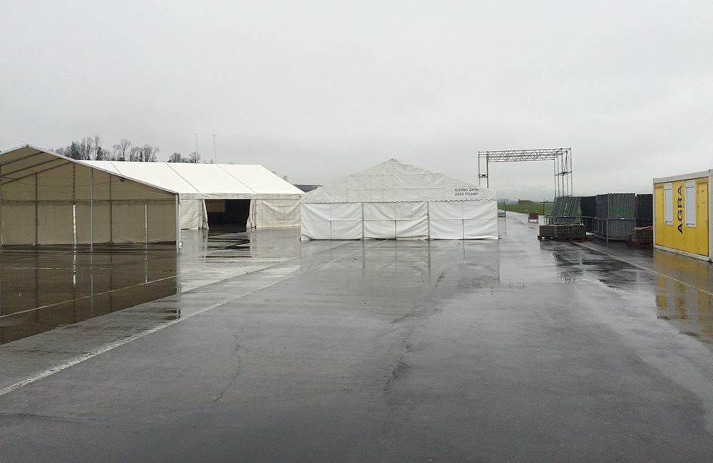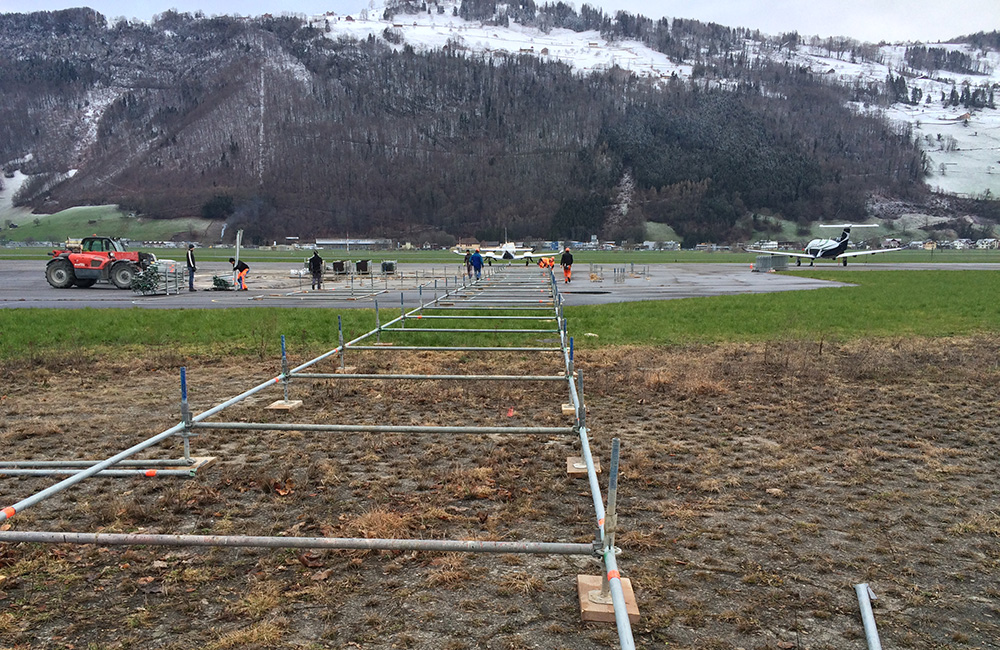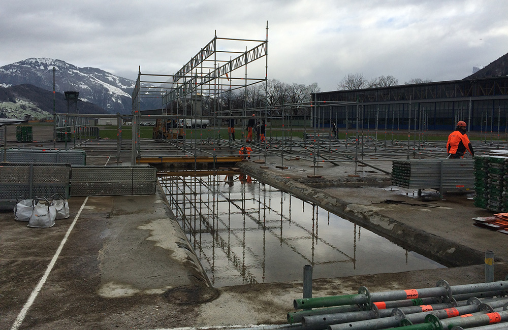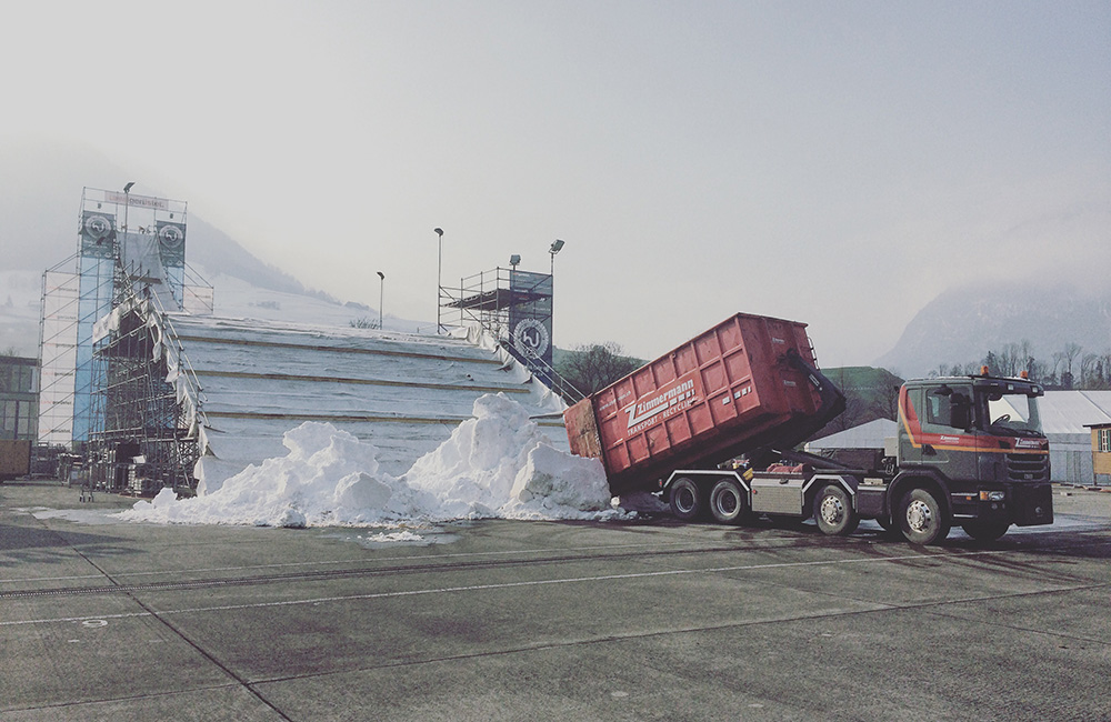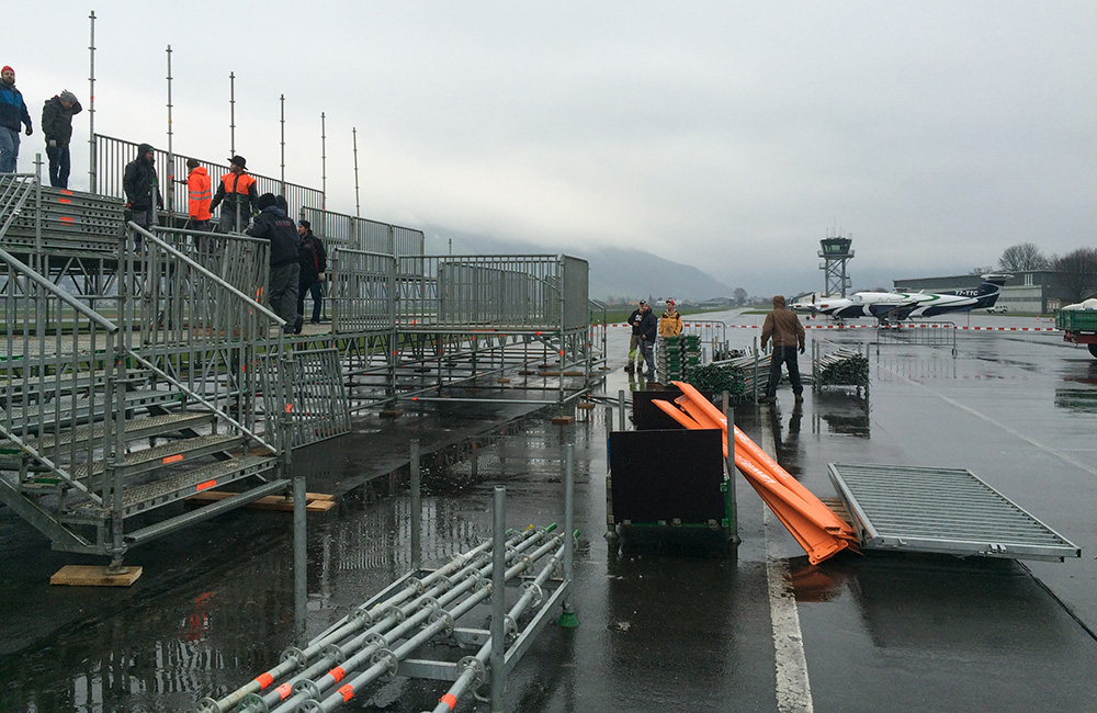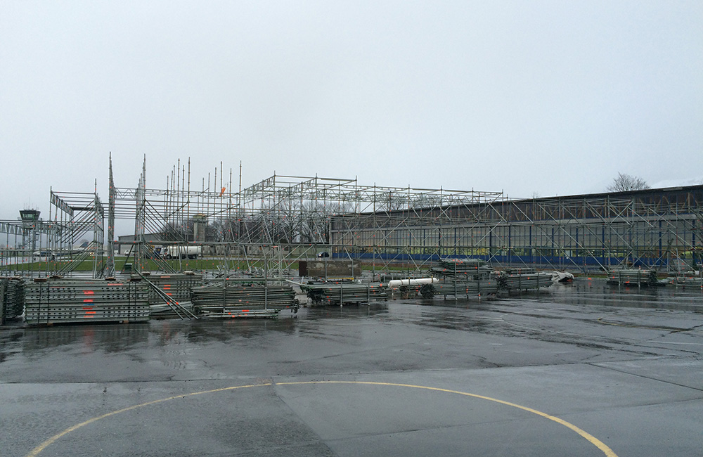 Am Donnerstag, 3. März starteten die Aufbauarbeiten für die Infrastruktur für den Freestyle-Event hill jam 8. Rund 80 Tonnen Gerüstmaterial wurden eigens dafür von Lawil Gerüstet auf den Flugplatz Buochs gebracht. Genug Material um die 20 m hohe Lawil-Rampe sowie die Tribühne und das Eingangstor zu errichten. Dank der Hilfe der rund 270 freiwilligen Helfer und ein paar schweren Maschinen wurde innert weniger Tage das Areal 2016 aus dem Boden gestampft.