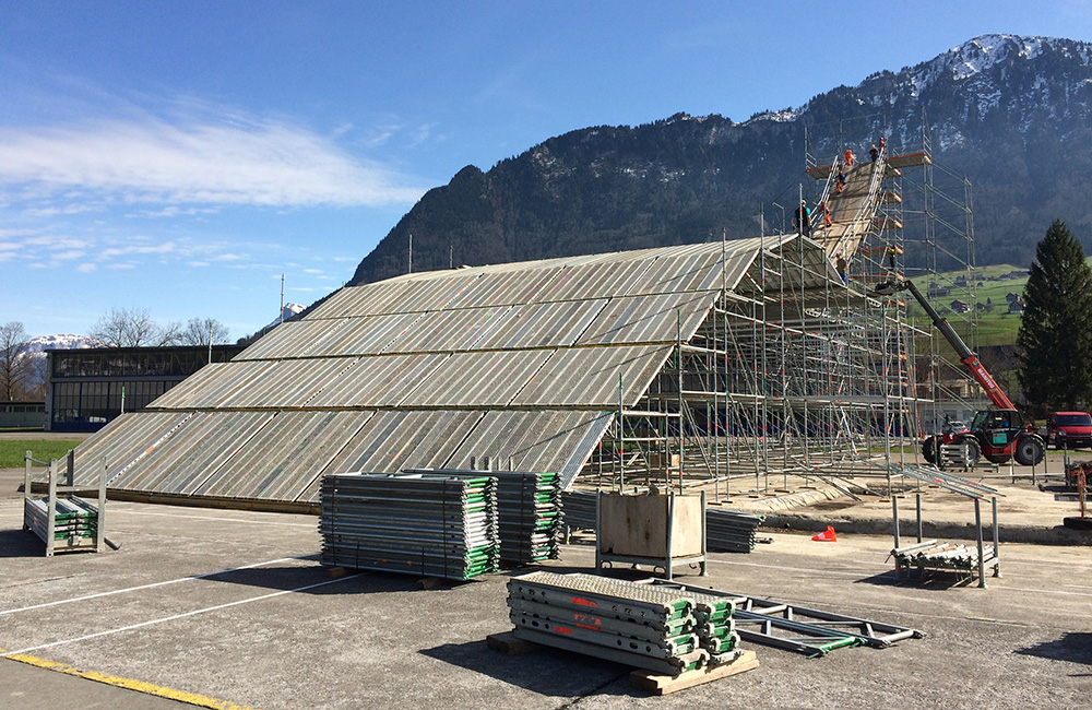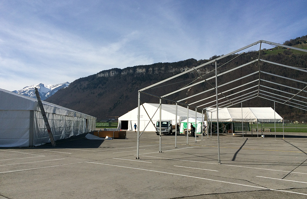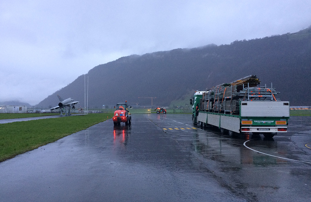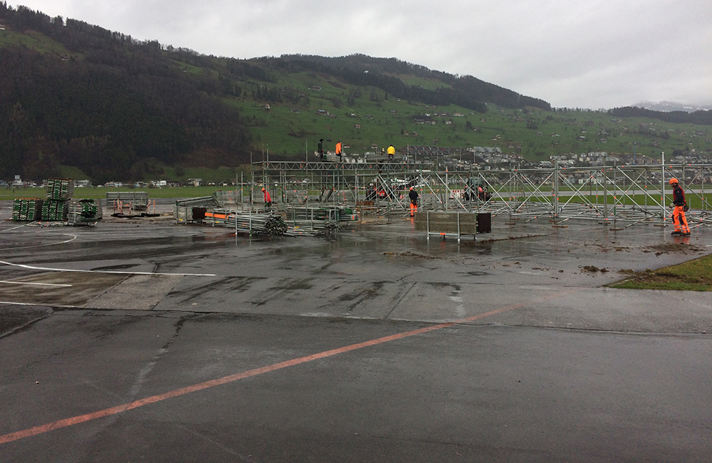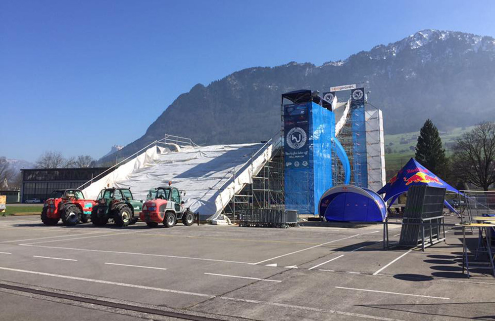 Am Donnerstag, 9. März starteten die Aufbauarbeiten für die Infrastruktur für den Freestyle-Event hill jam 9. Rund 80 Tonnen Gerüstmaterial wurden eigens dafür von Lawil Gerüstet auf den Flugplatz Buochs gebracht. Genug Material um die 20 m hohe Lawil-Rampe sowie die Tribühne und das Eingangstor zu errichten. Dank der Hilfe der rund 300 freiwilligen Helfer und ein paar schweren Maschinen wurde innert weniger Tage das Areal für den hill jam aus dem Boden gestampft.